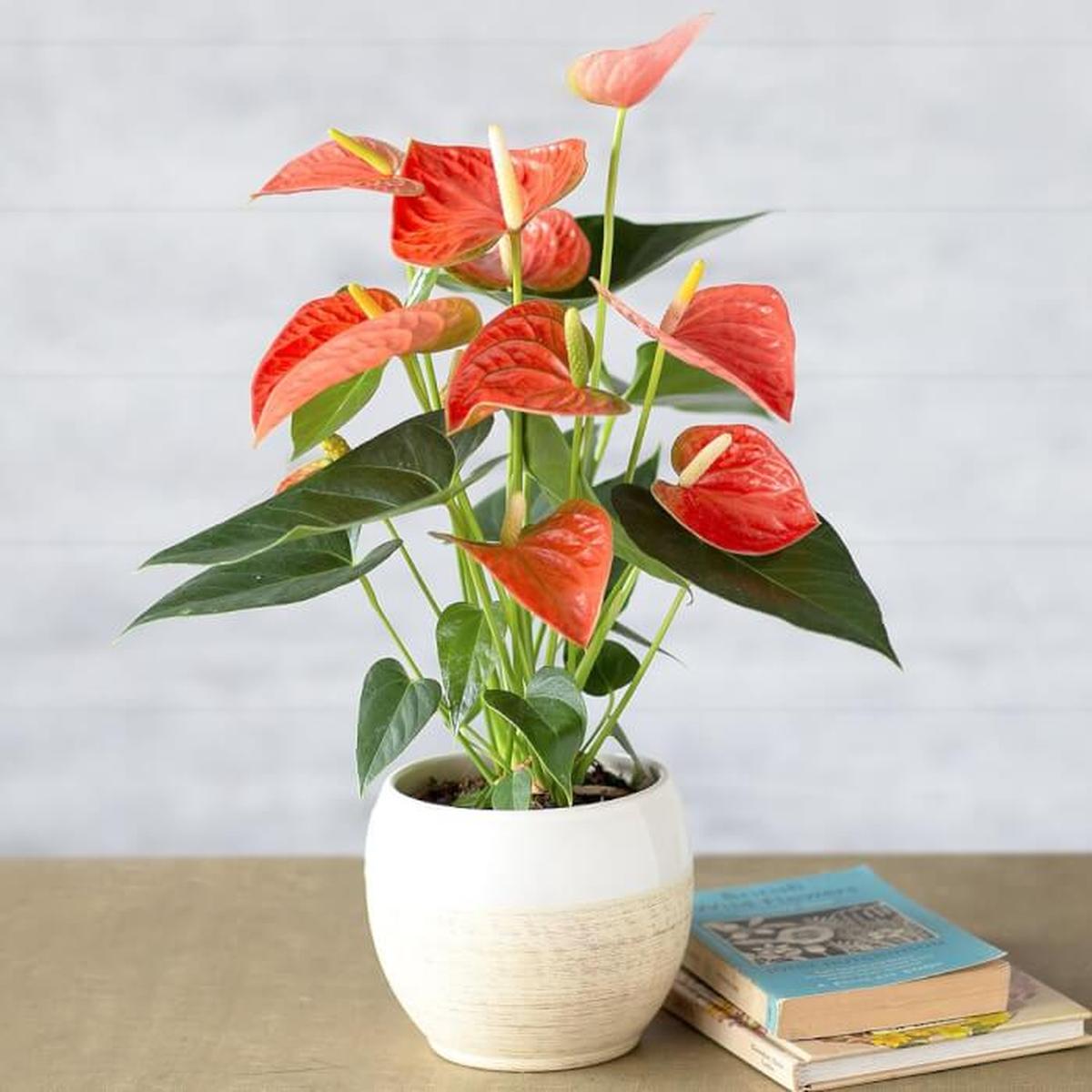 Anthurium brings a vibrant touch to any indoor setting, thriving best with high humidity and moderate to bright light. Its heart-shaped leaves and bright blooms add a tropical feel, especially when grown in a shallow tray of pebbles and water.
