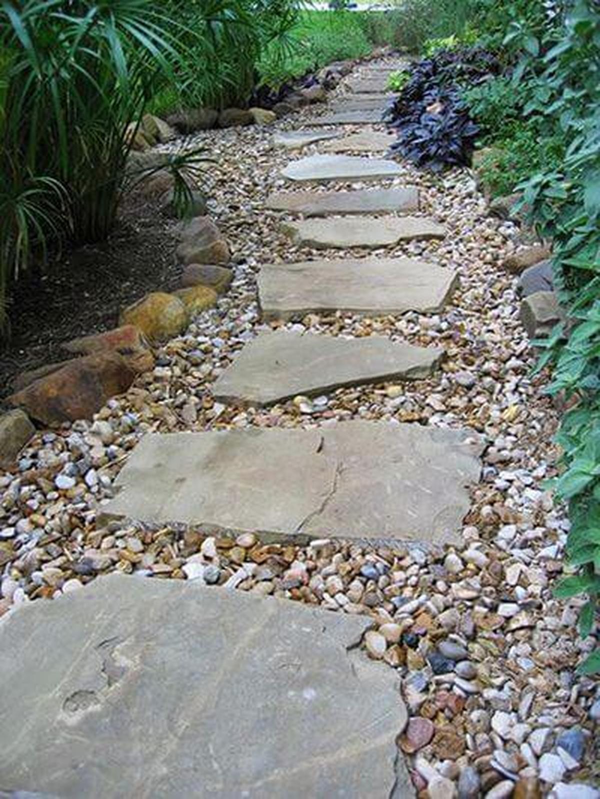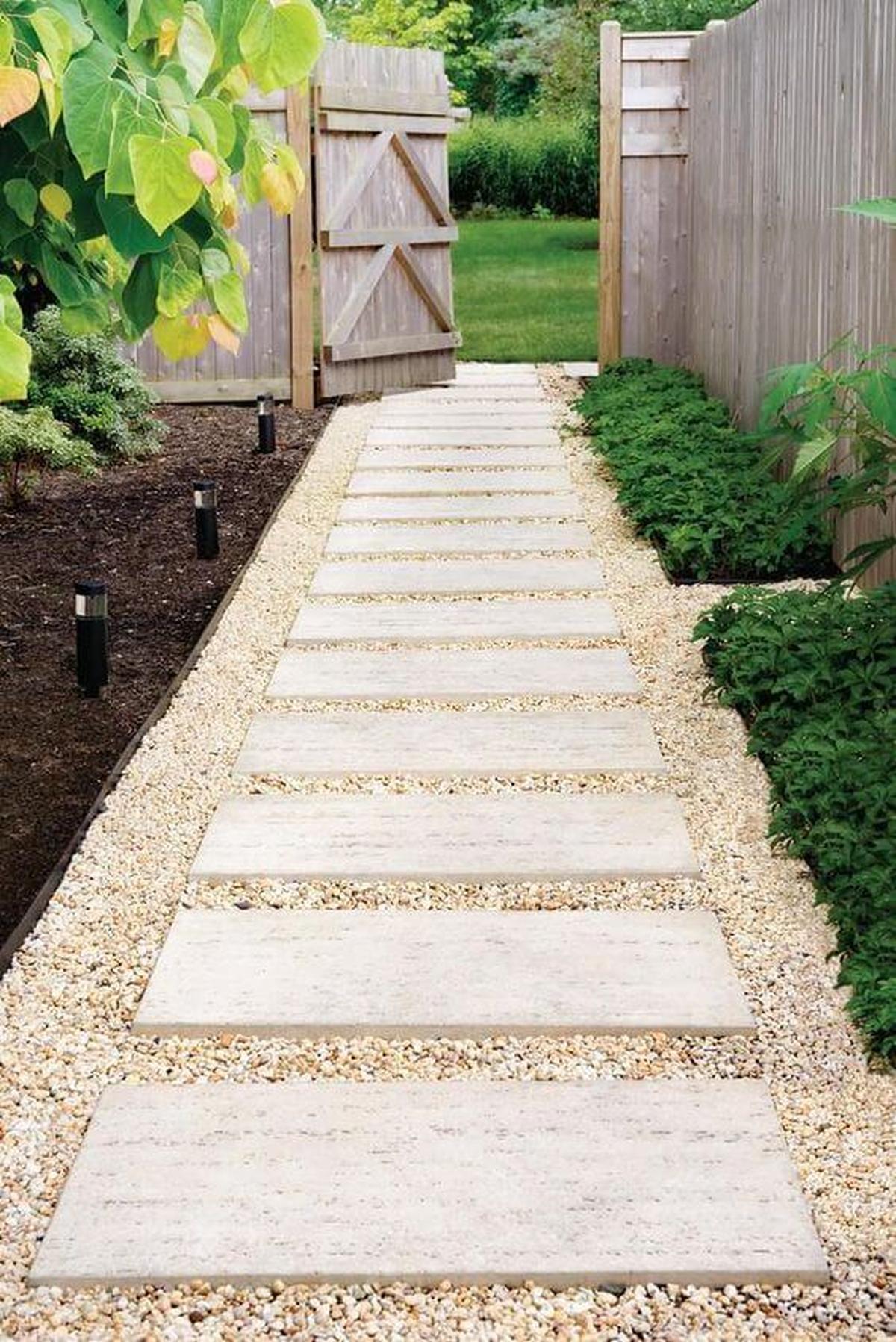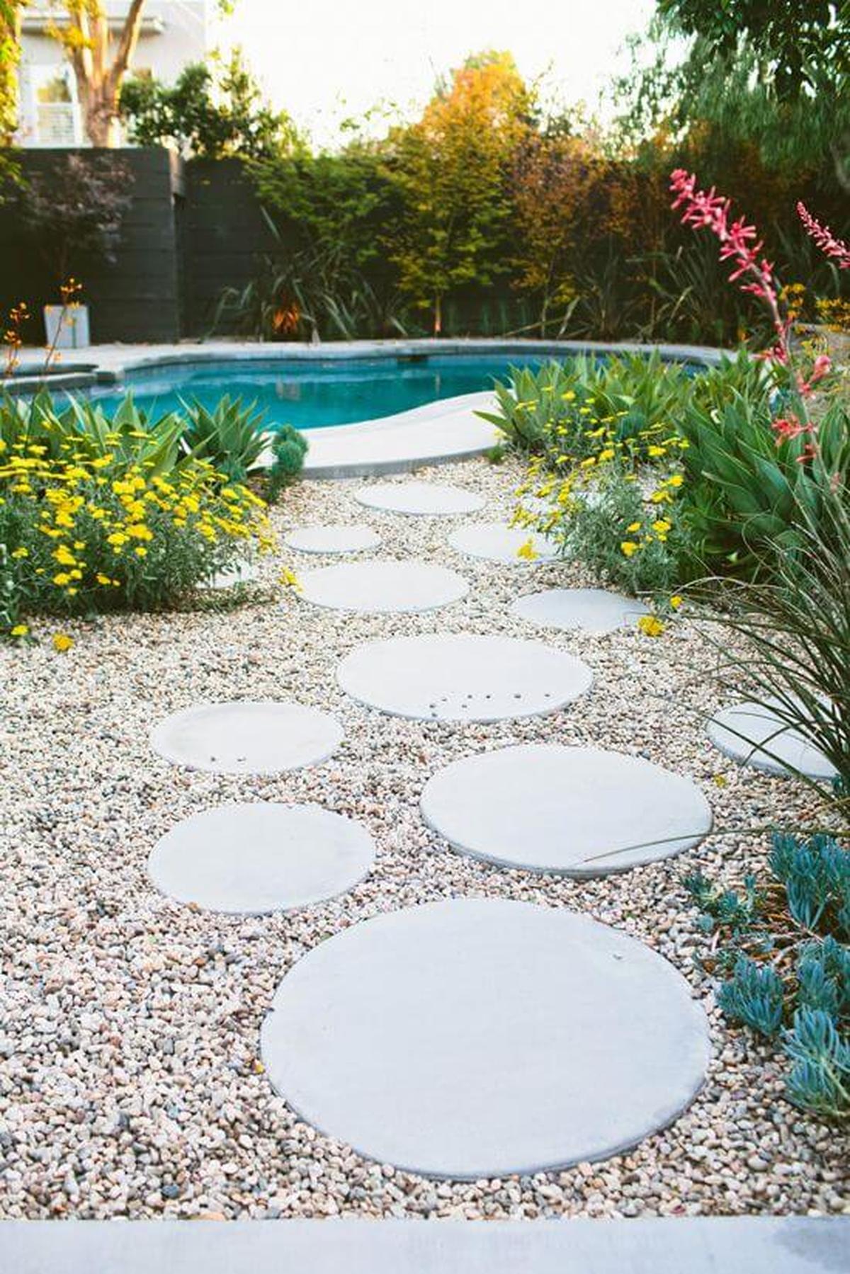 A pathway of smooth concrete slabs, framed by a bed of fine gravel, invites exploration in your garden.