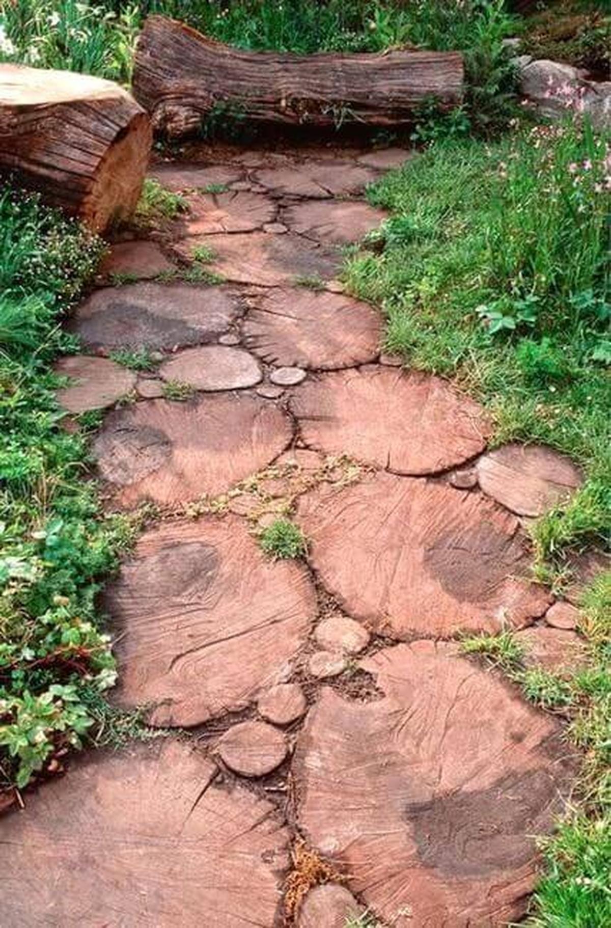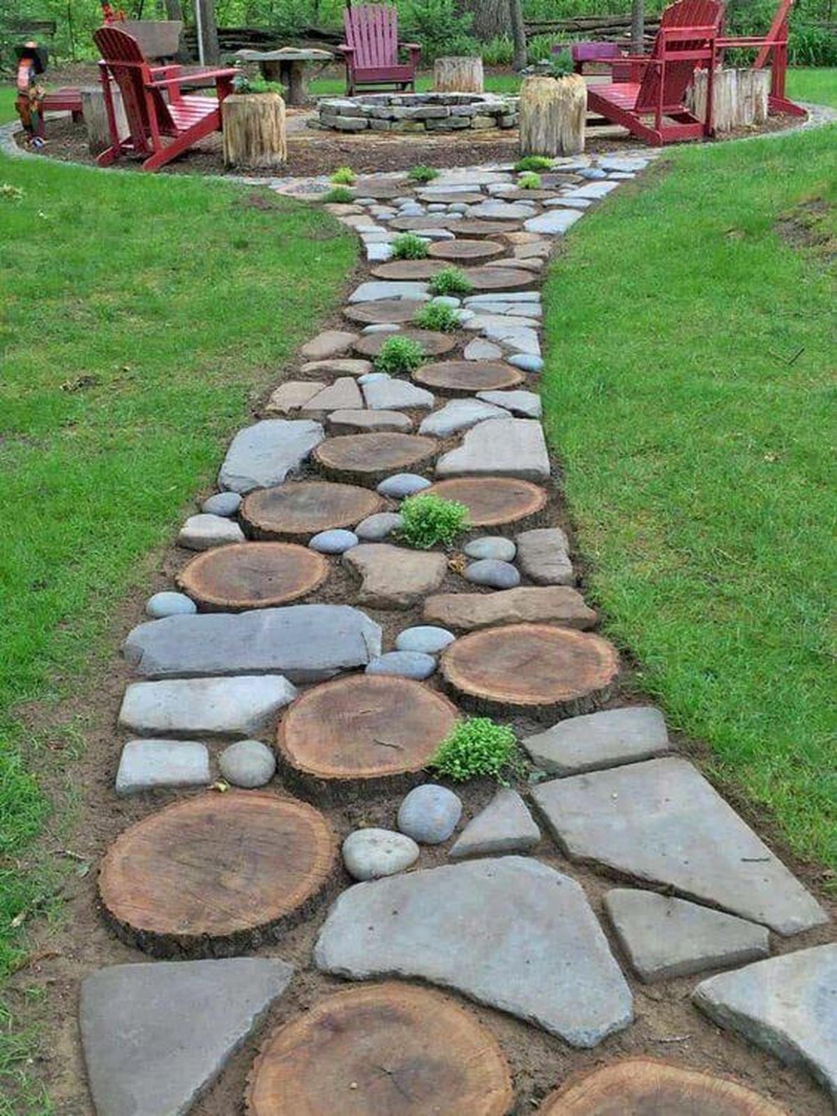 A pathway crafted from a mix of rustic wooden slices and smooth stones invites you to explore your garden in an enchanting way.