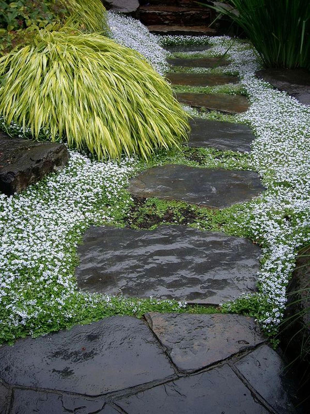 The cool hues of the stones contrast beautifully against the vibrant greenery, creating a soothing journey from one delightful spot to another.