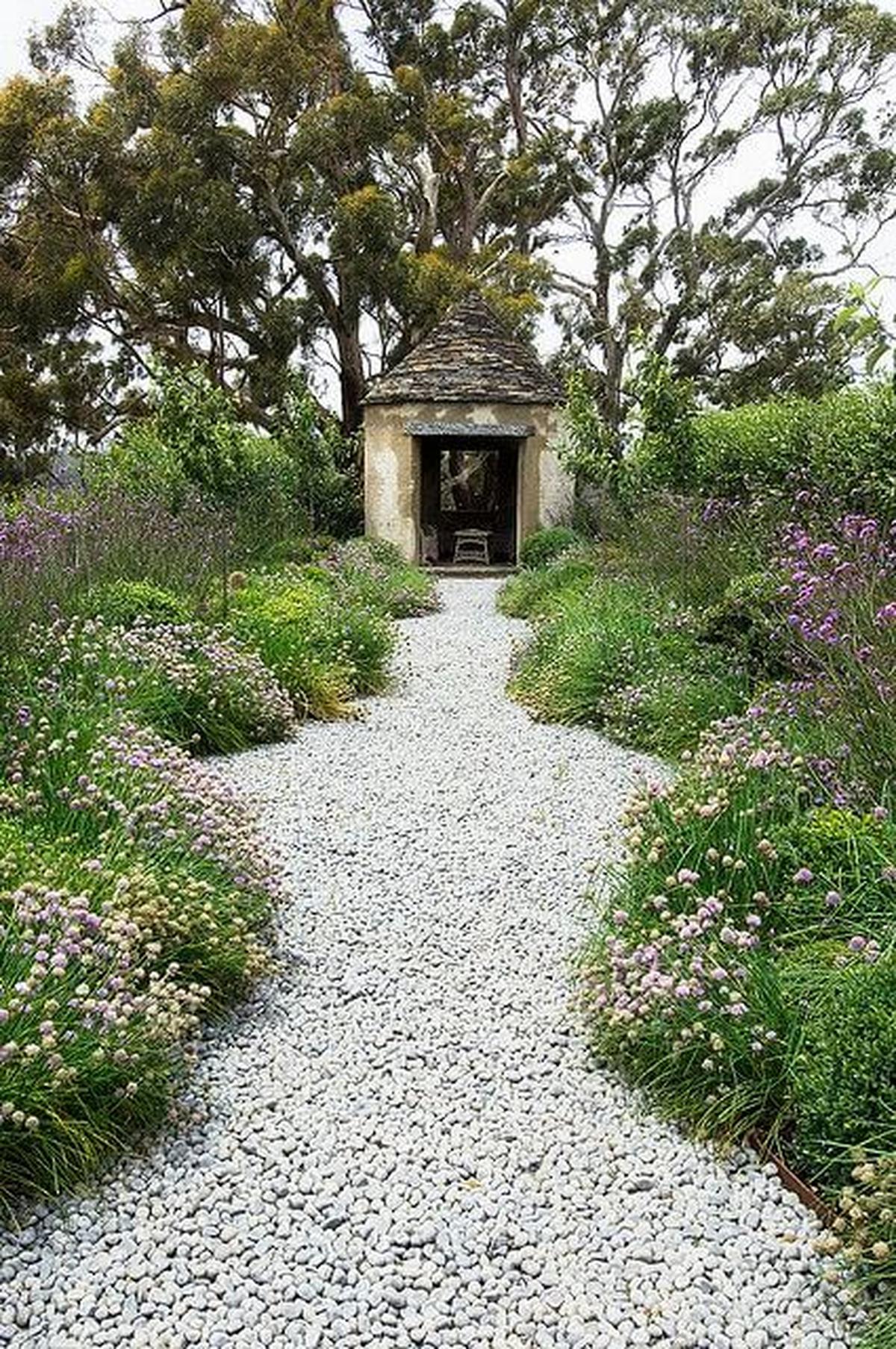A winding gravel path leads you through a lush garden adorned with clusters of delicate flowers, inviting exploration at every turn.