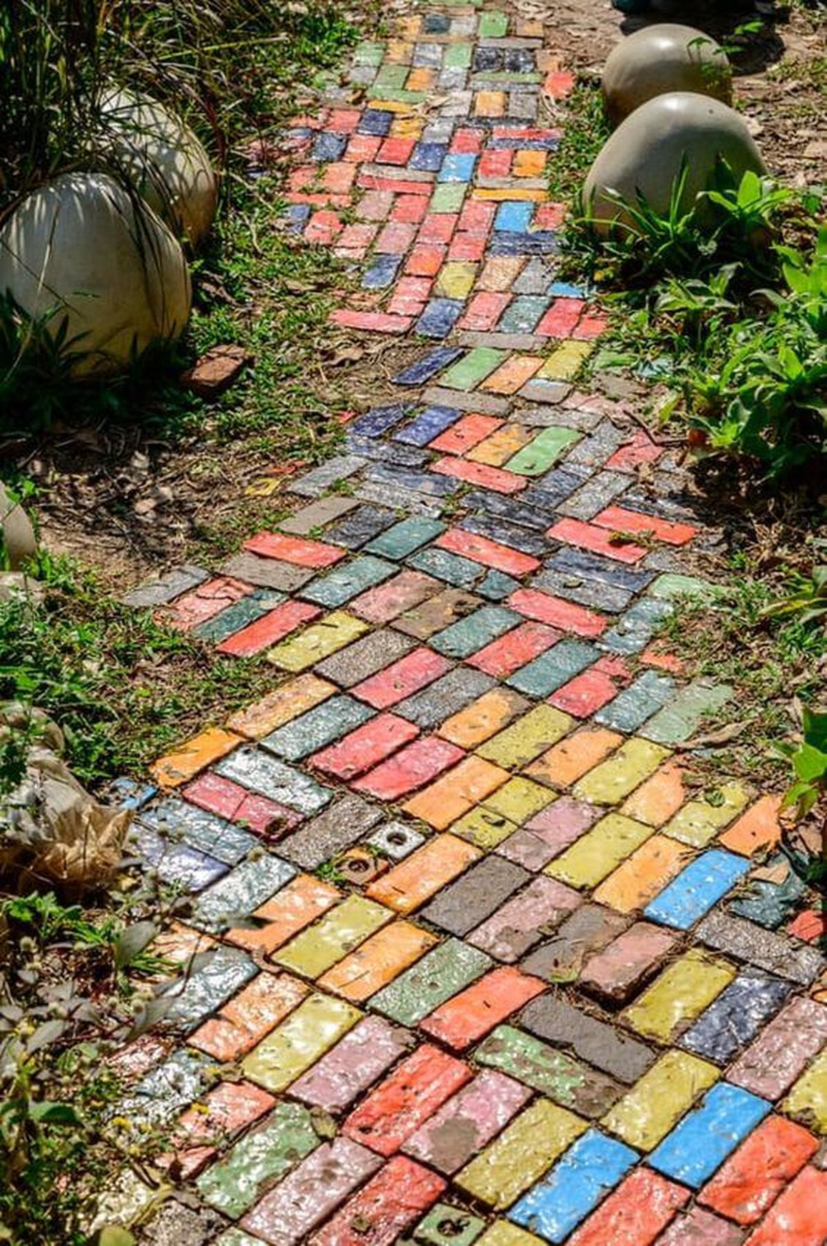 A mosaic path invites exploration with its playful arrangement of colorful tiles, weaving through your garden like a vibrant ribbon.