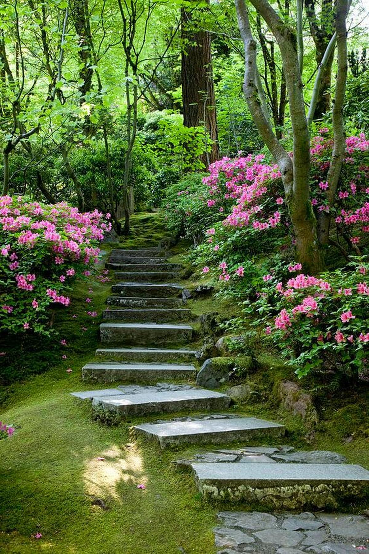 The rugged charm of stone stairs leads you through a lush garden, inviting exploration at every turn.