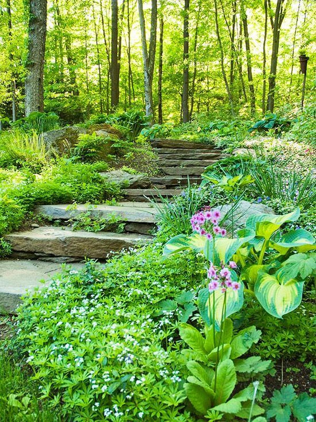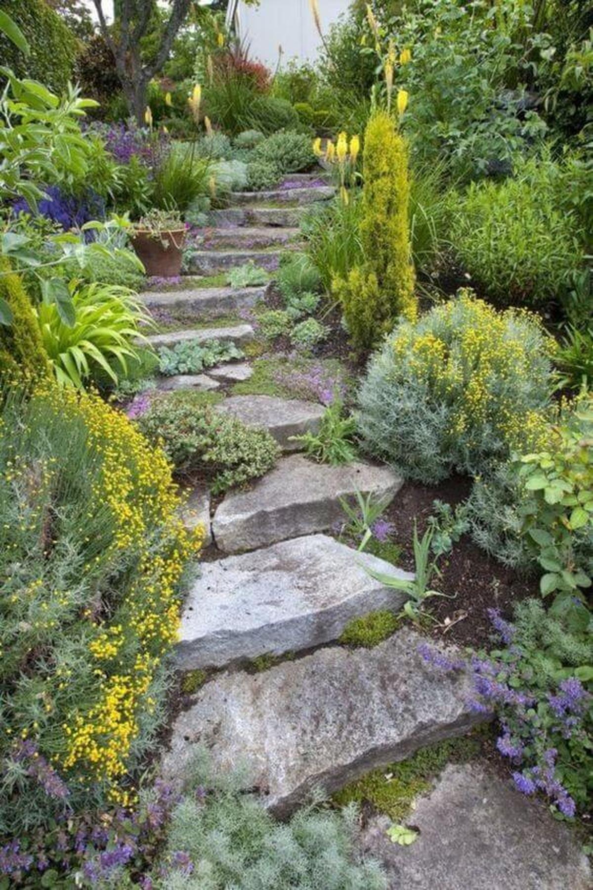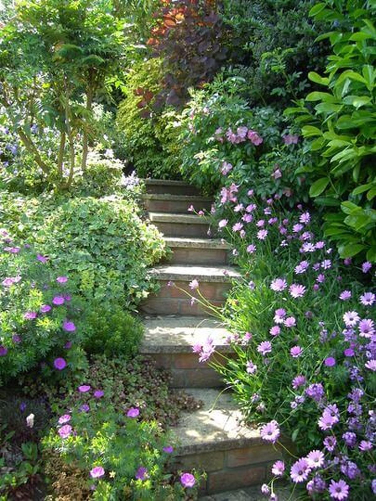 Earthy tones harmonize beautifully with the greenery, while low-growing plants frame each step for added texture and interest.