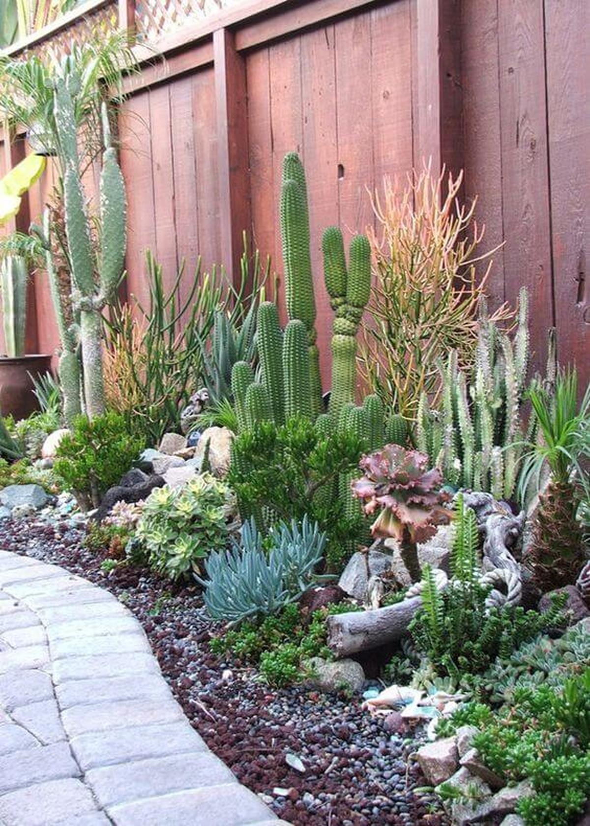 A stunning desert garden corner brings an earthy vibe to your outdoor space, showcasing a variety of cacti and succulents that thrive in warm climates.