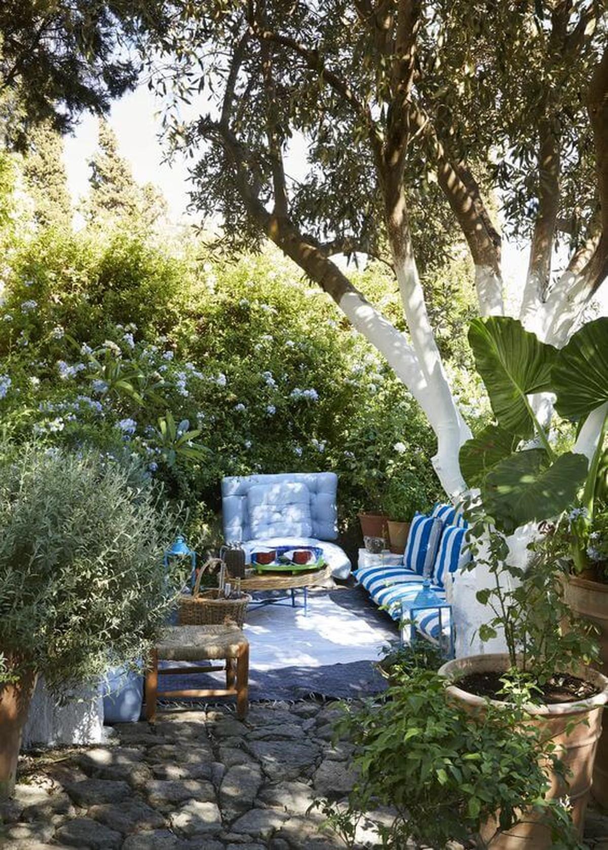 Soft blue hues from the cushions harmonize beautifully with lush greenery, creating an inviting space that feels both refreshing and warm.