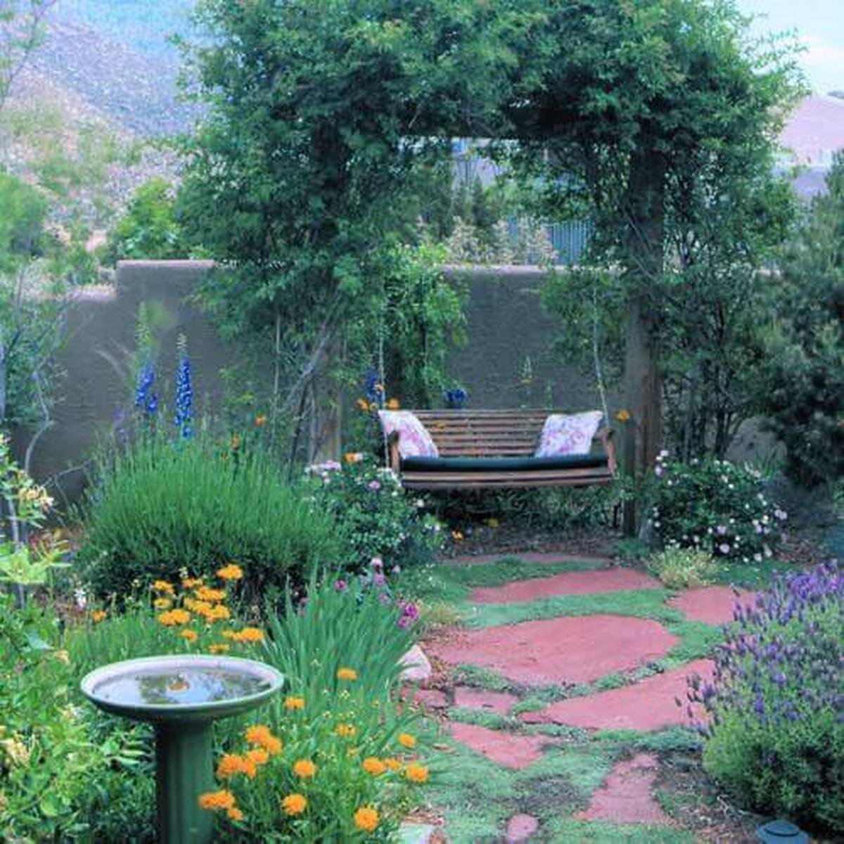 With delicate details like a birdbath nearby, this space becomes perfect for enjoying nature while sipping tea or reading a favorite book.