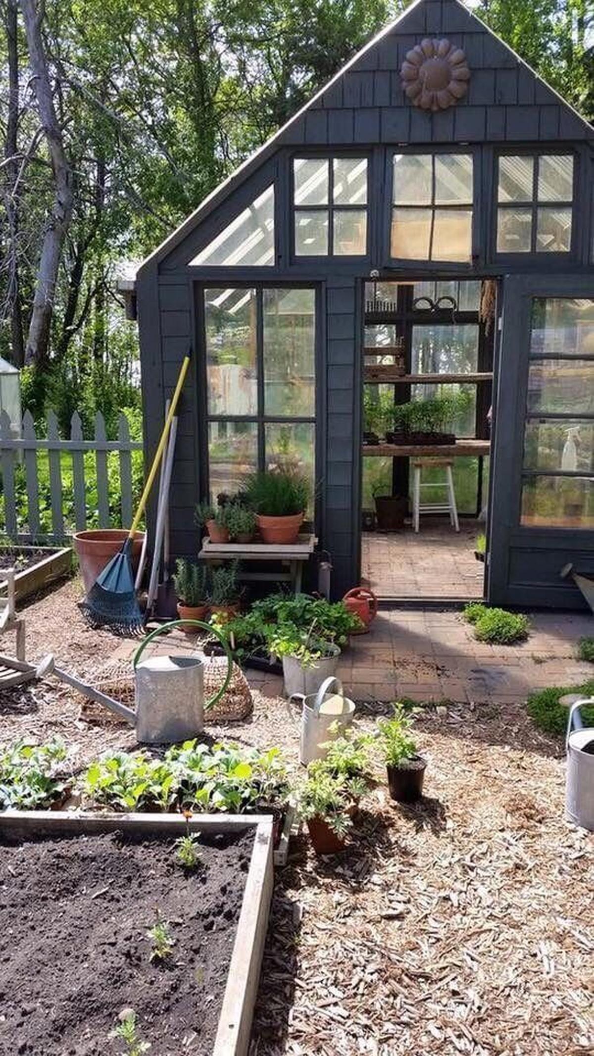 A charming greenhouse nestled in a lush garden corner invites creativity and cultivation.