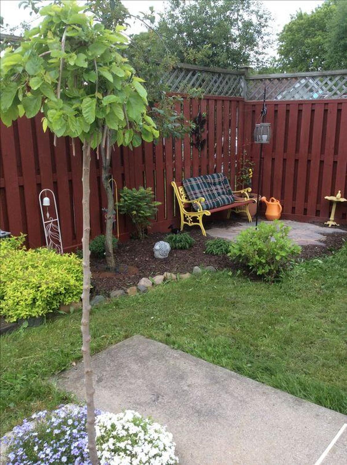 A cozy nook awaits, featuring a charming yellow bench that invites relaxation amid lush greenery.