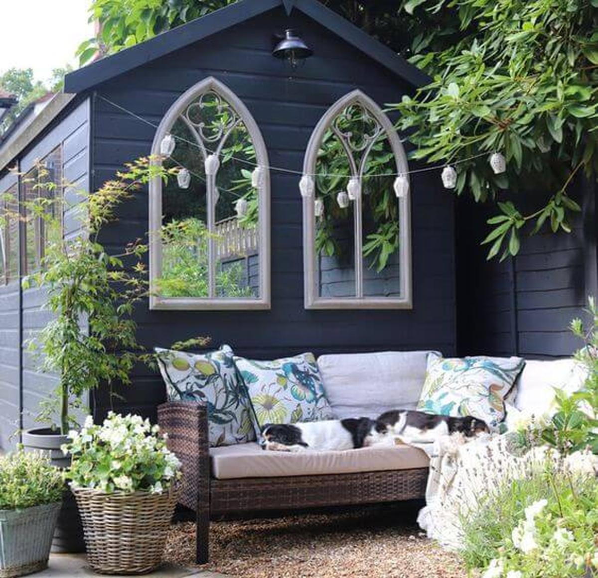 A cozy retreat awaits with a charming garden shed that features elegant arched windows, inviting natural light while adding architectural interest.