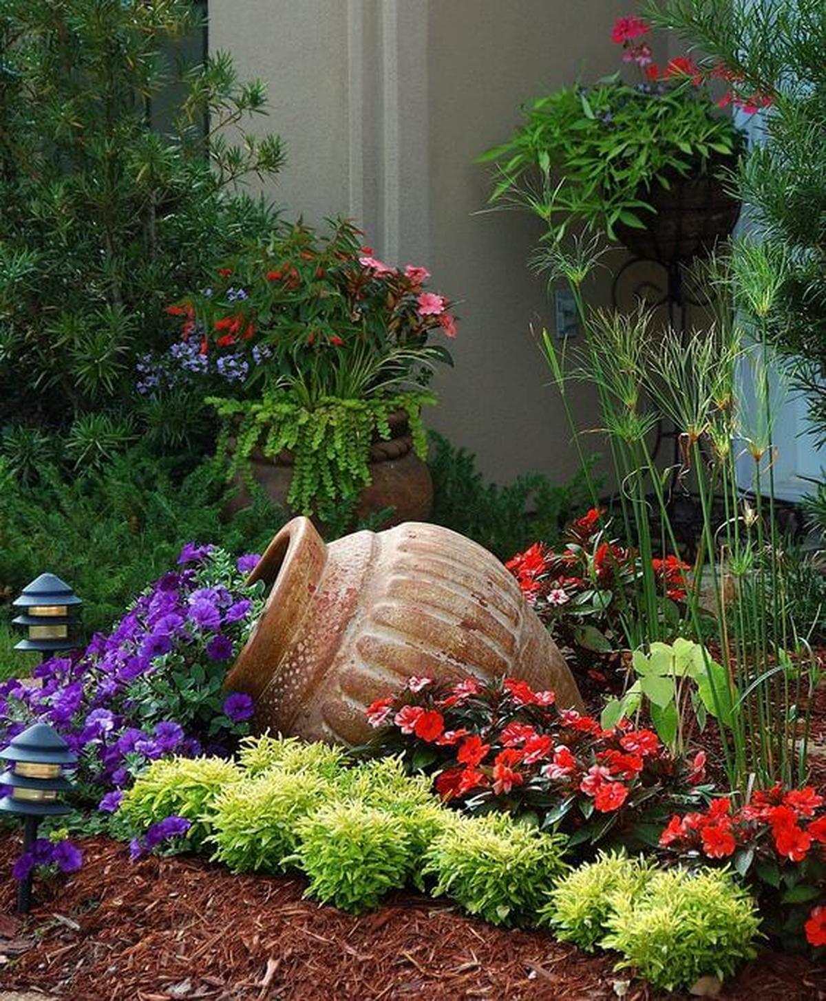 A rustic terracotta pot tipped over spills a cascade of color, creating a lively scene in your garden corner.