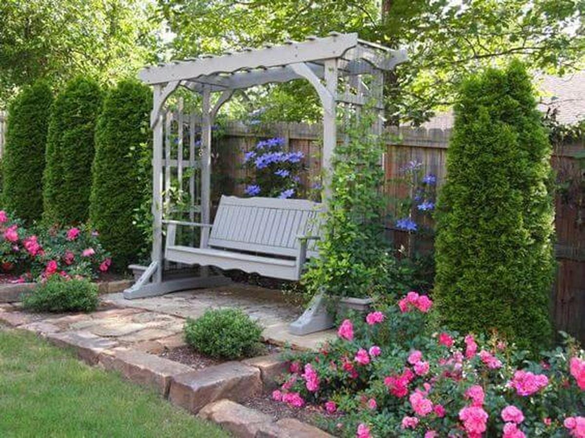 A cozy bench nestled beneath a leafy arbor invites moments of relaxation and reflection in your garden corner.