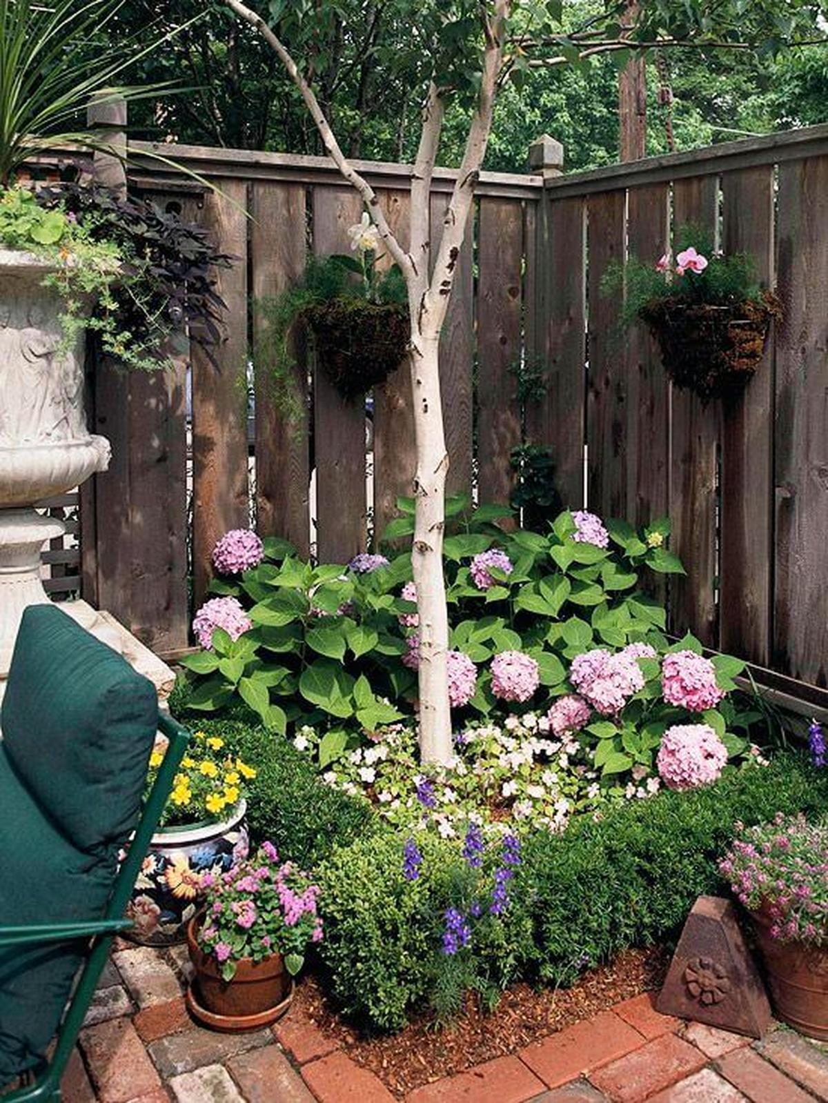 A cozy garden corner becomes a sanctuary with its lush hydrangeas and vibrant blooms, inviting you to pause and enjoy nature’s beauty.