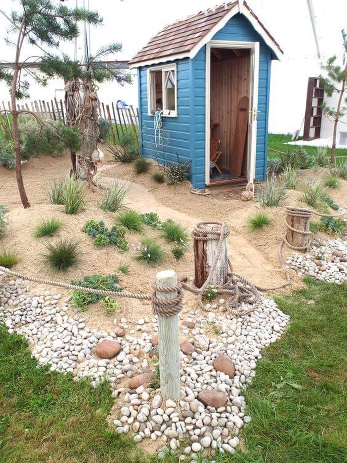 Nautical ropes and rustic barrels infuse a maritime vibe, ideal for those seeking inspiration or relaxation in their outdoor space.